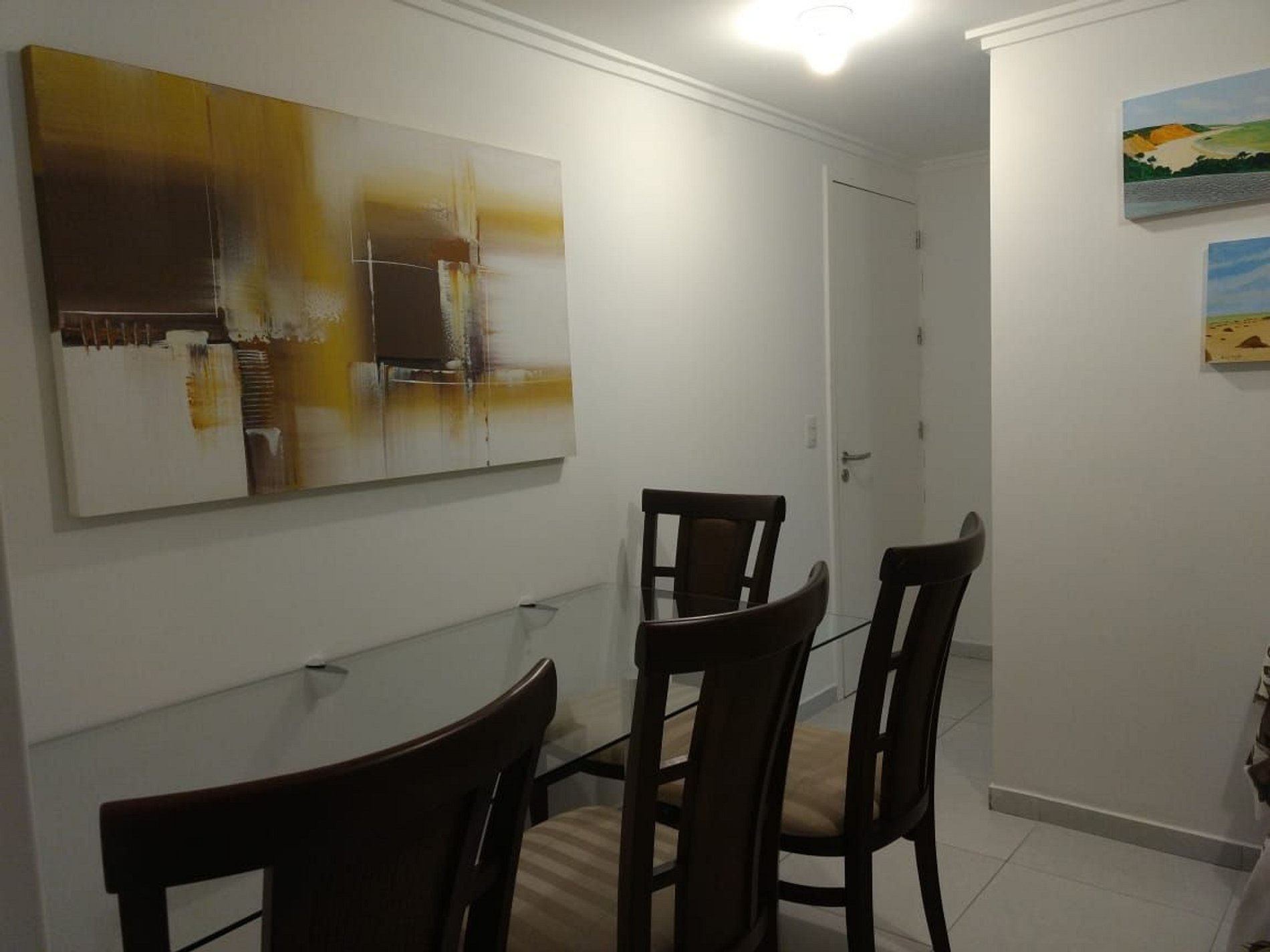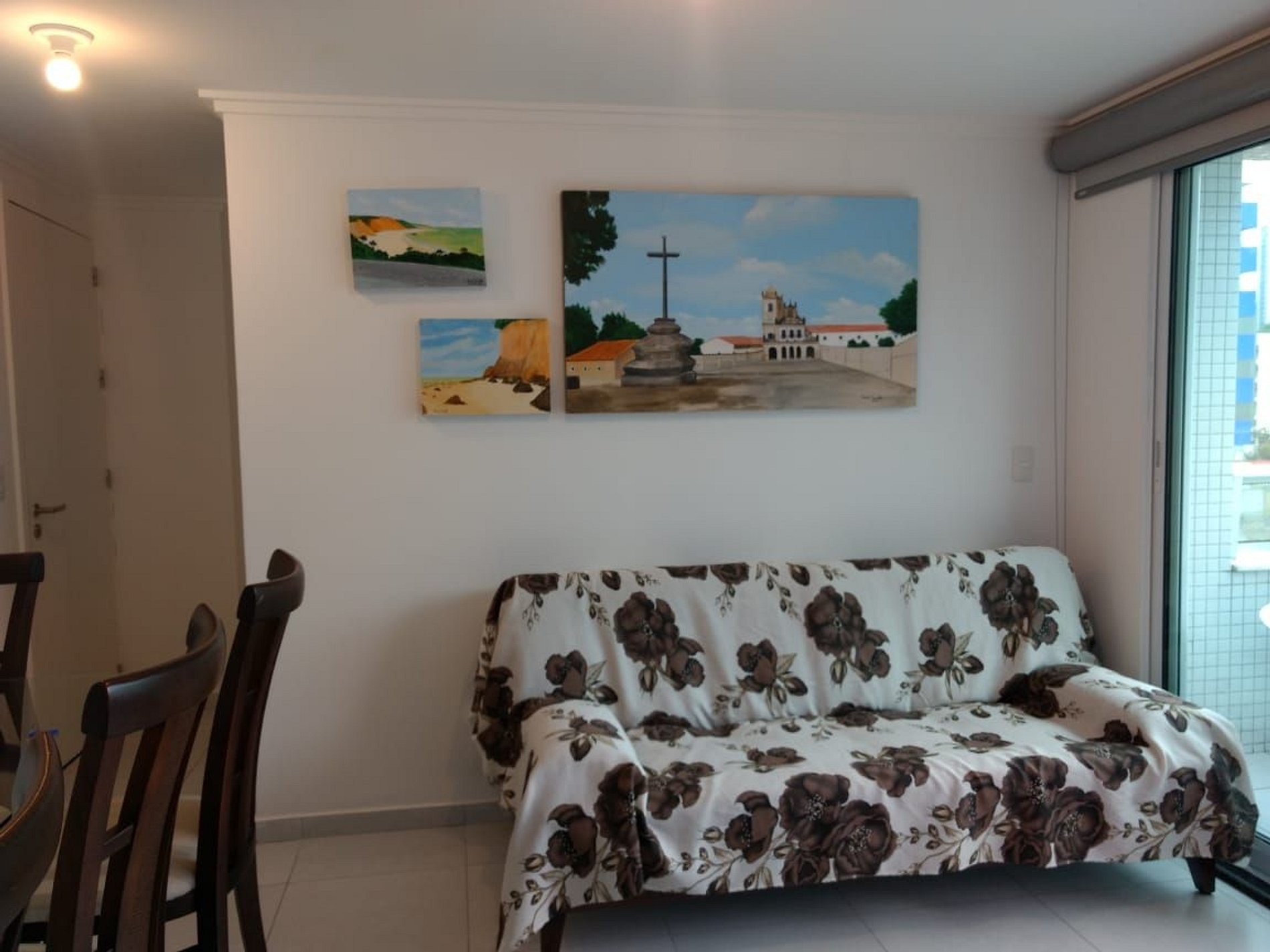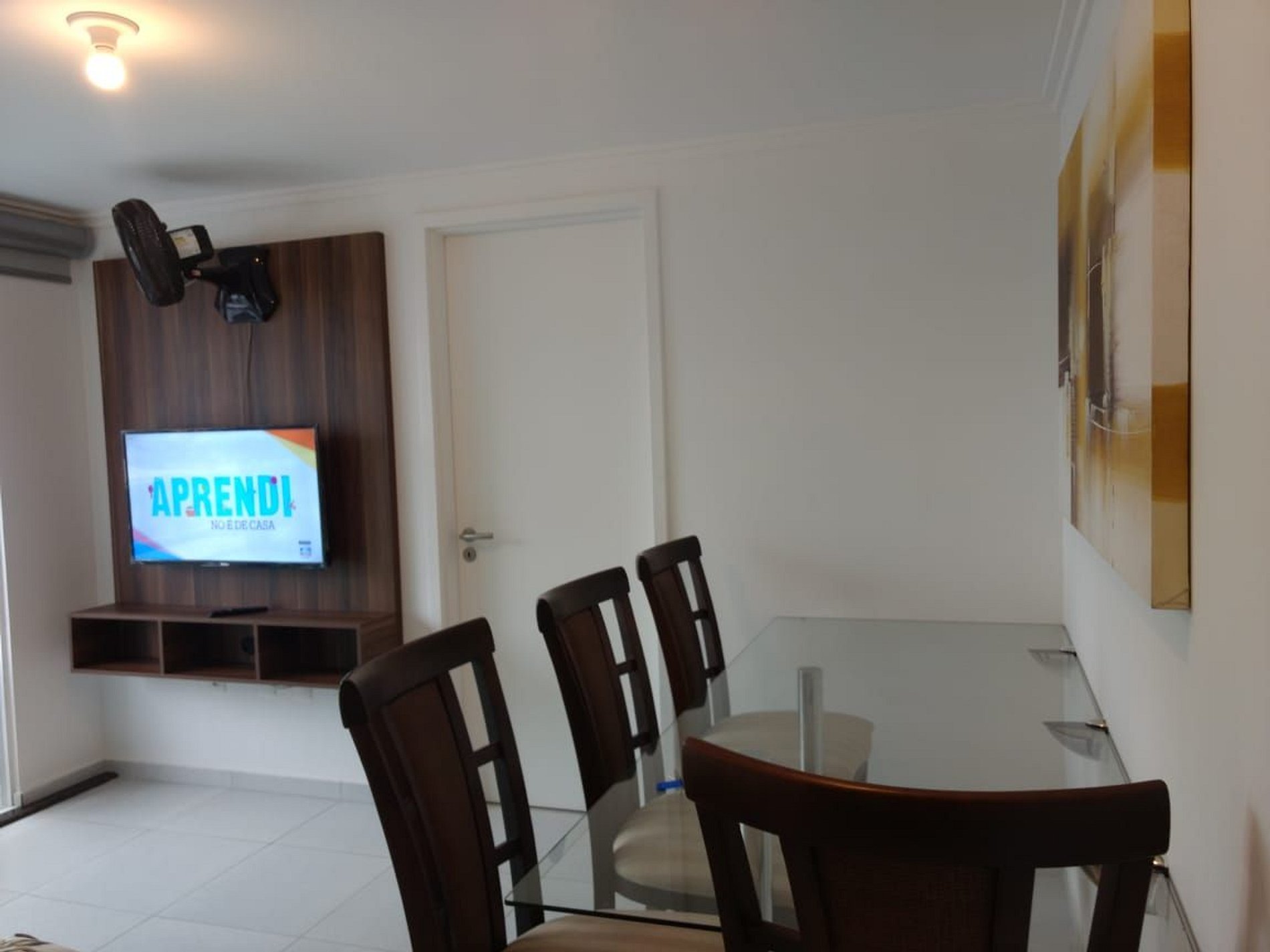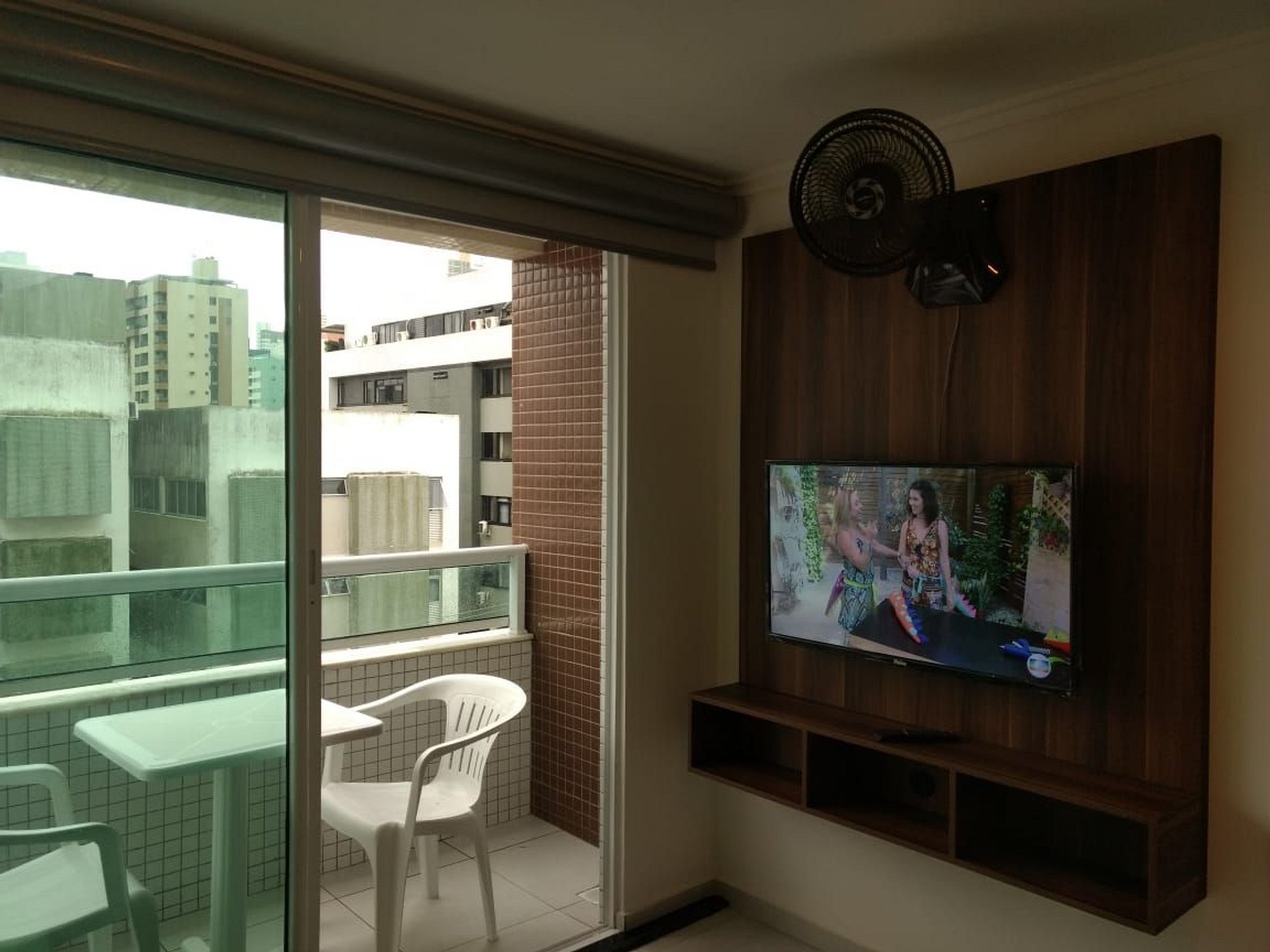 Sala com mesa e quatro cadeiras bem aconchegantes, sofá-cama, Smartv, ventilador e varanda. Cortina blackout.