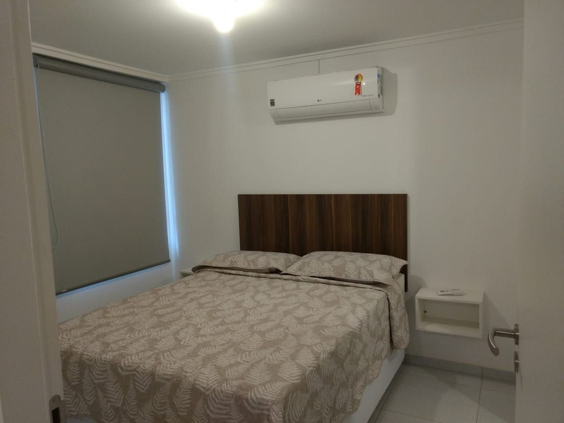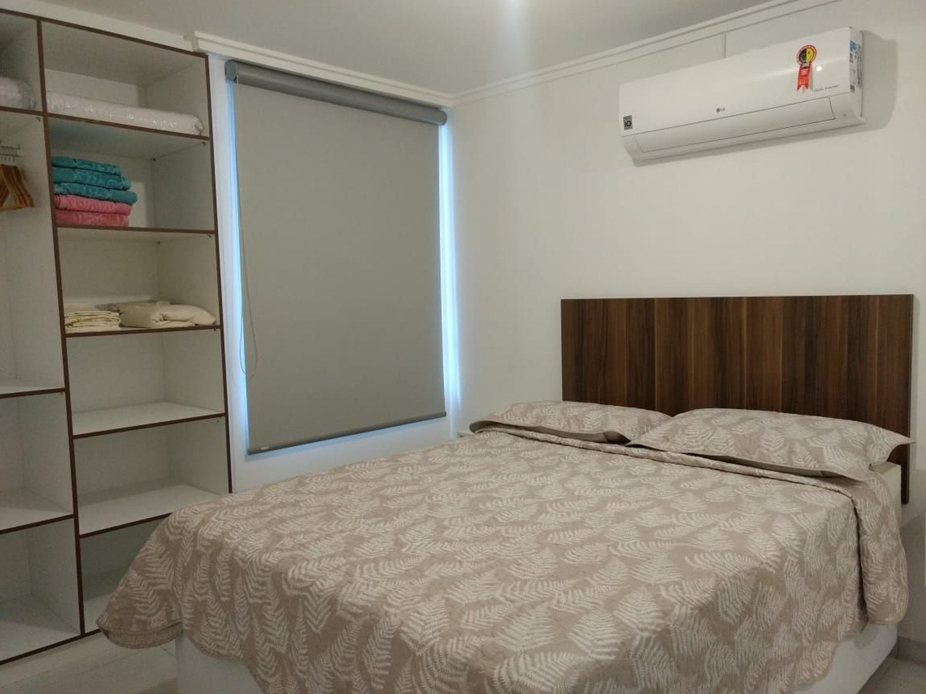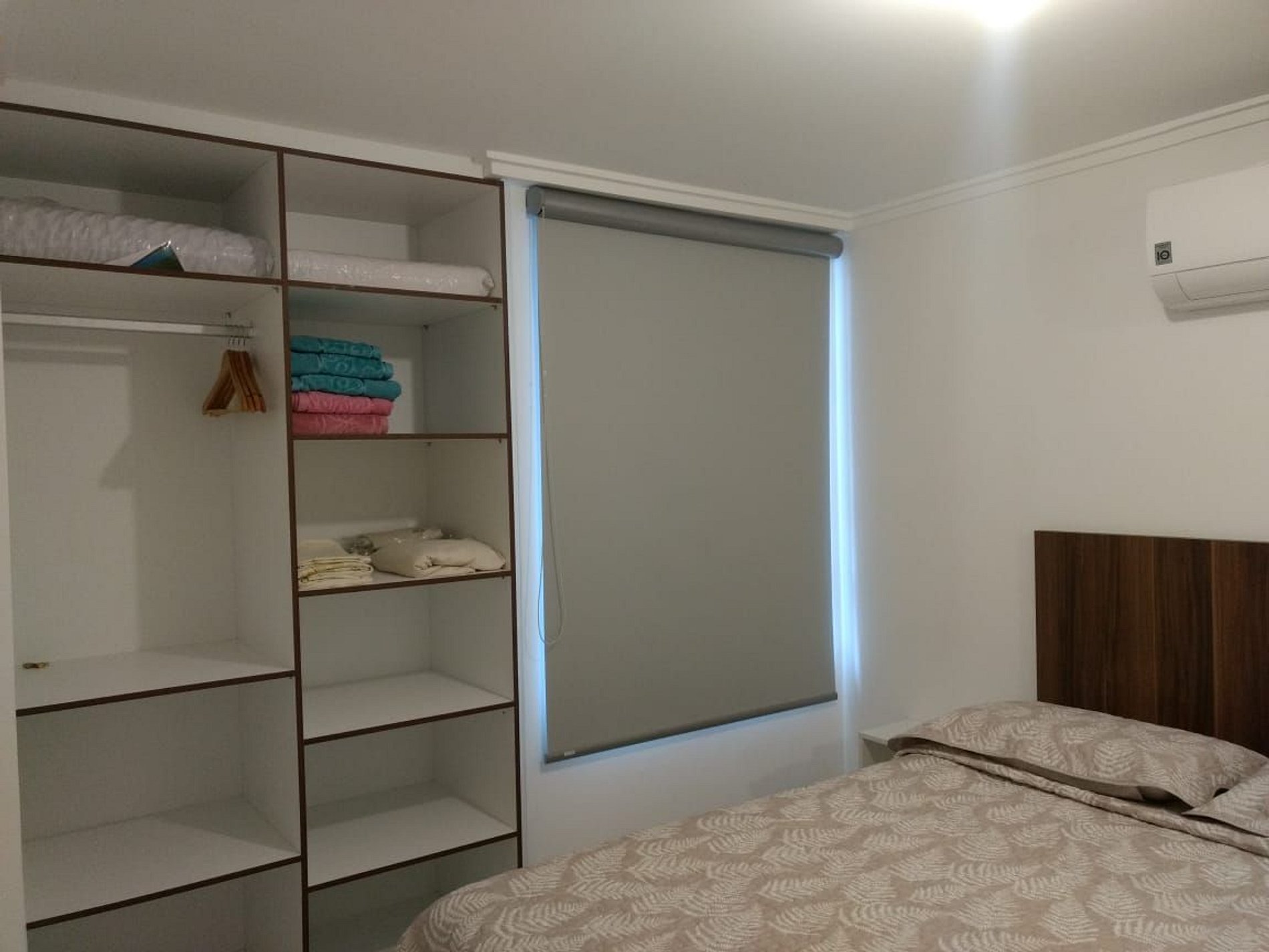 Quarto com cama de casal, guarda-roupas e ar condicionado de 12.000 btu que gela o apartamento todo. Cortinas blackout.