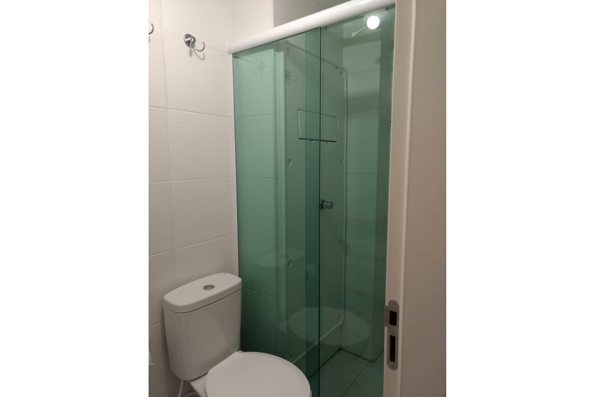 Banheiro com espelho grande, box de vidro e chuveiro elétrico.