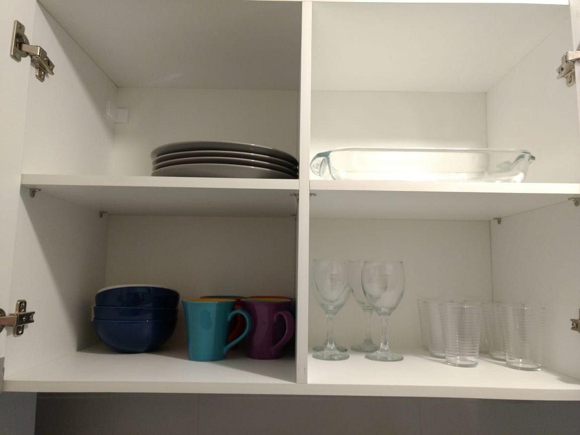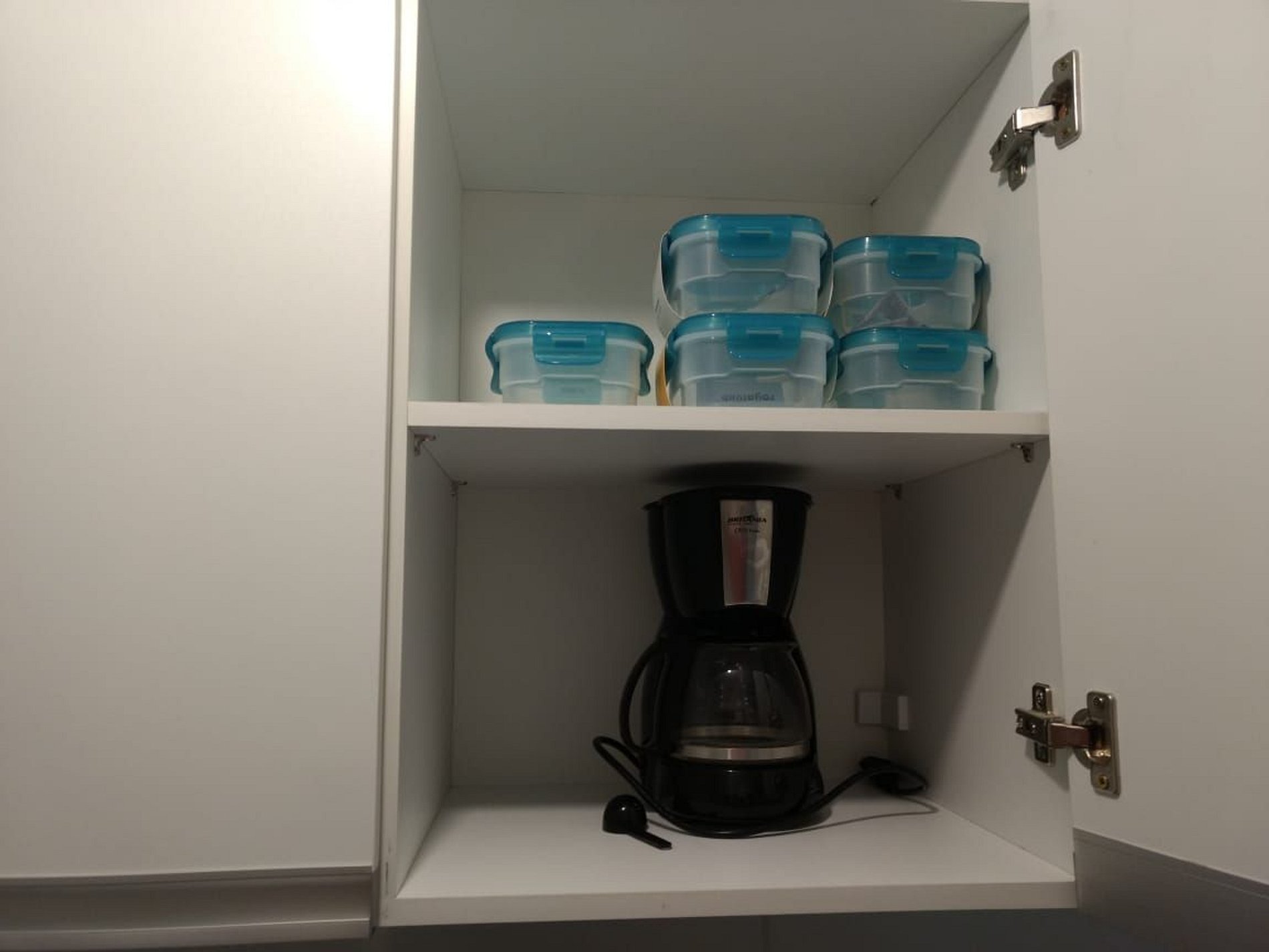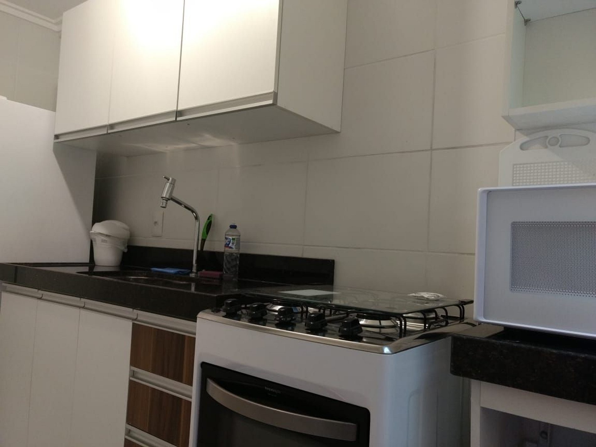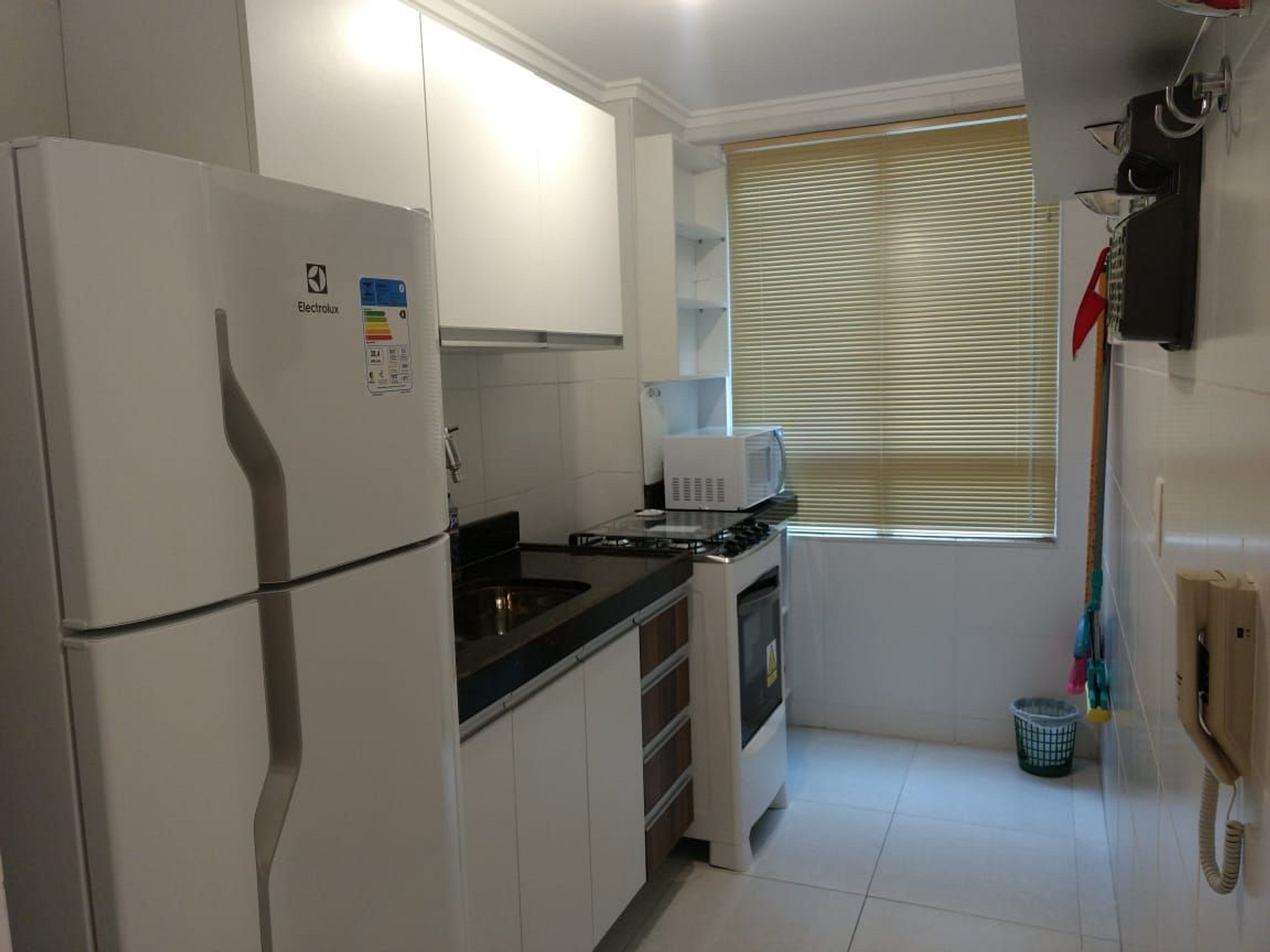 Apartamento com cozinha com móveis projetados, fogão com forno, microondas, geladeira, máquina de café, liquidificador, panelas, pratos, copos, xícaras, talheres, etc.