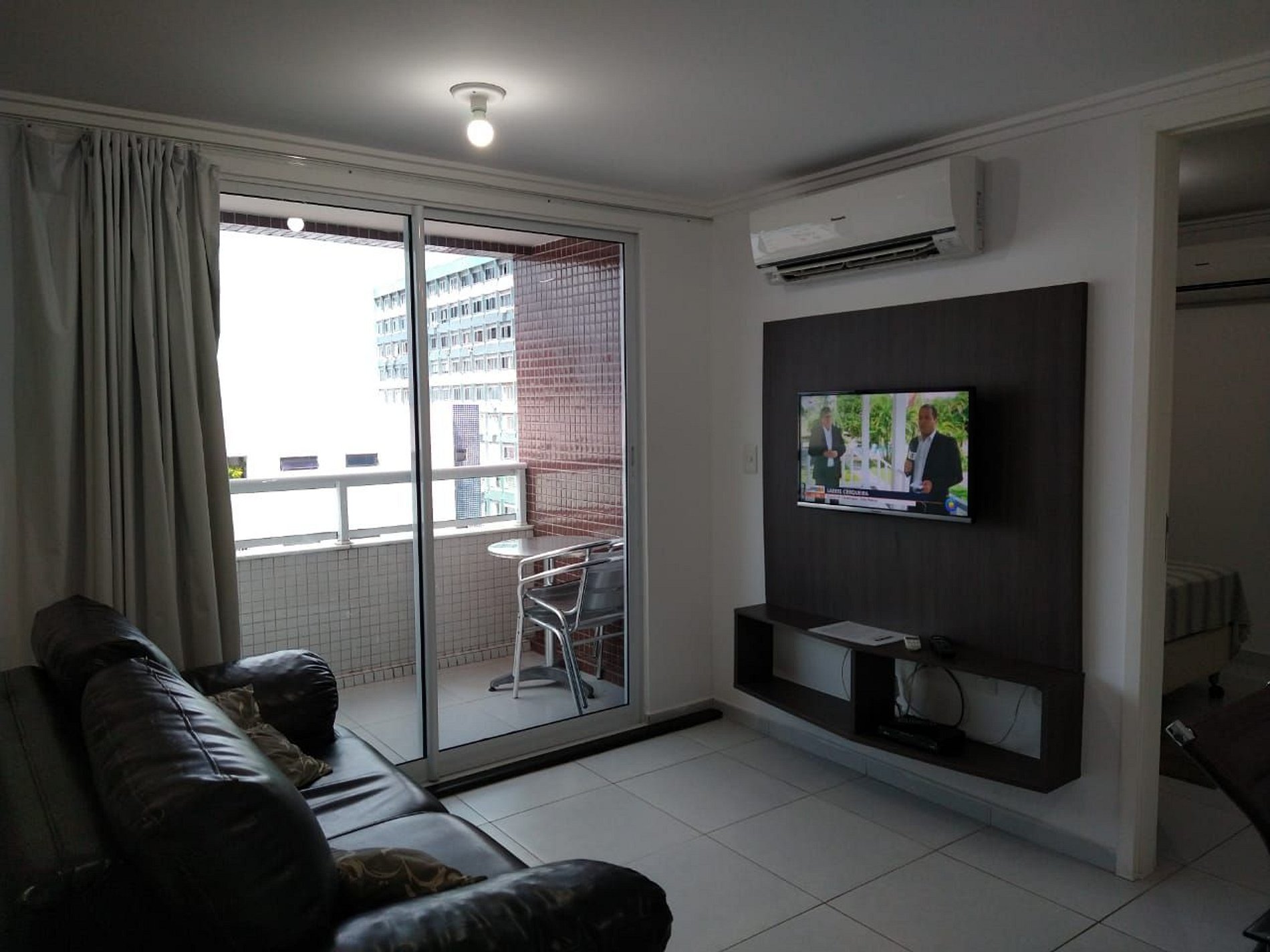 Cozinha completa com todos os utensílios, sala grande com sofá-cama de padrão excelente, smart TV, varanda, mesa e cadeiras para 4 pessoas mais as da varanda, cortinas black-out em todo o apartamento, ar condicionado no quarto e na sala, etc.