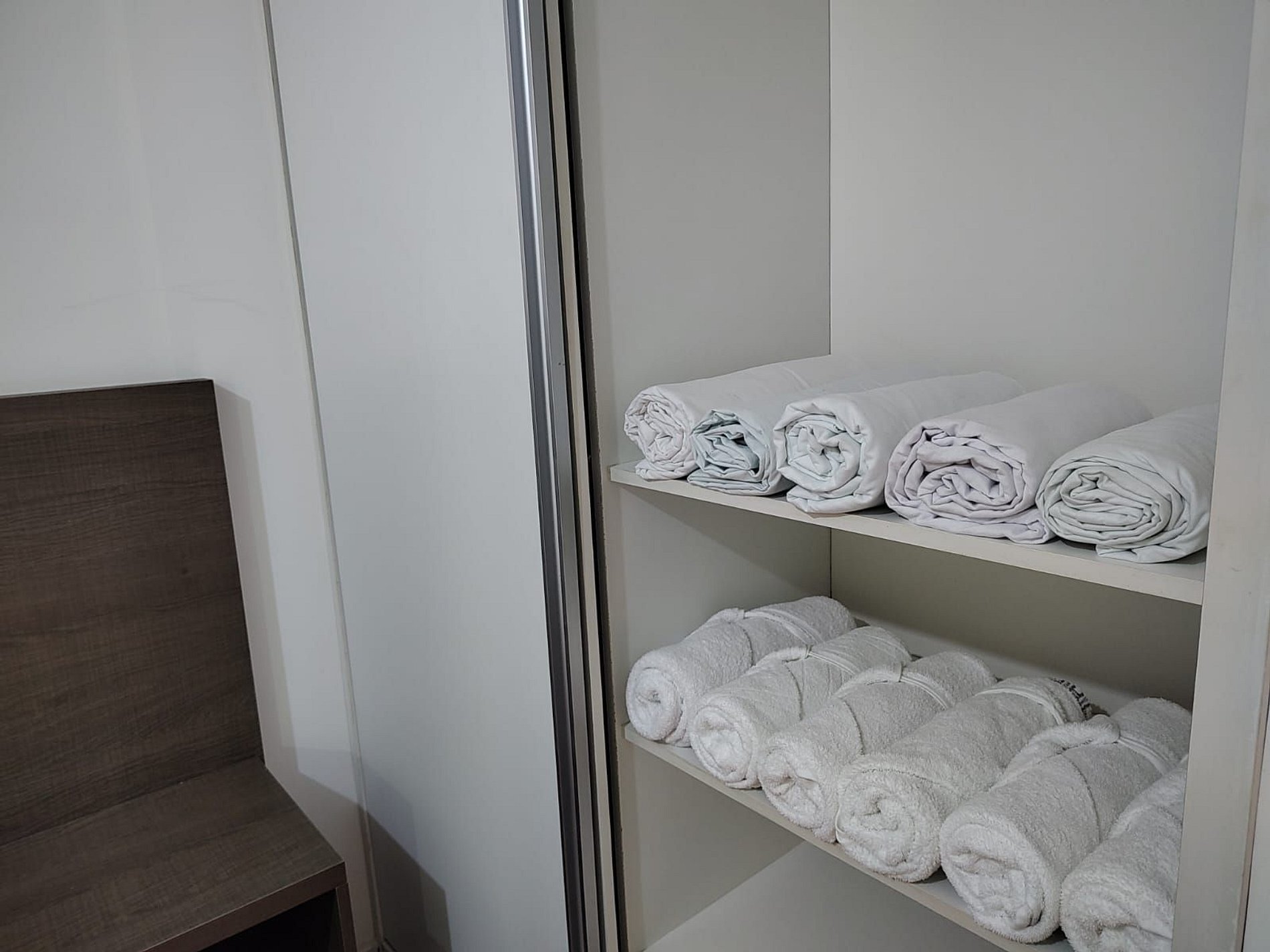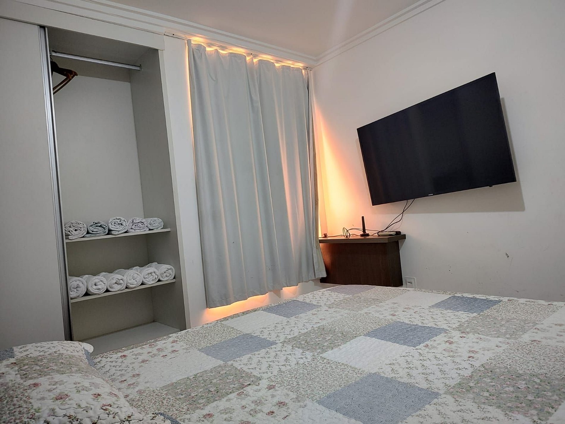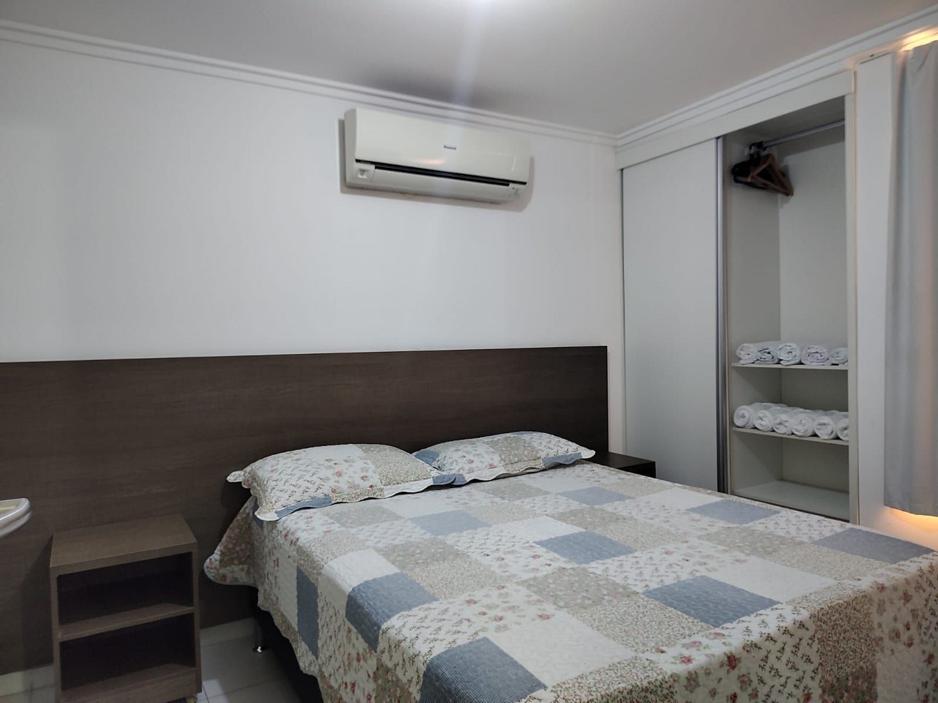 Quarto com Ar Condicionado de 9.000 BTU, cama de casal, 2 guarda-roupas e cortinas black-out.