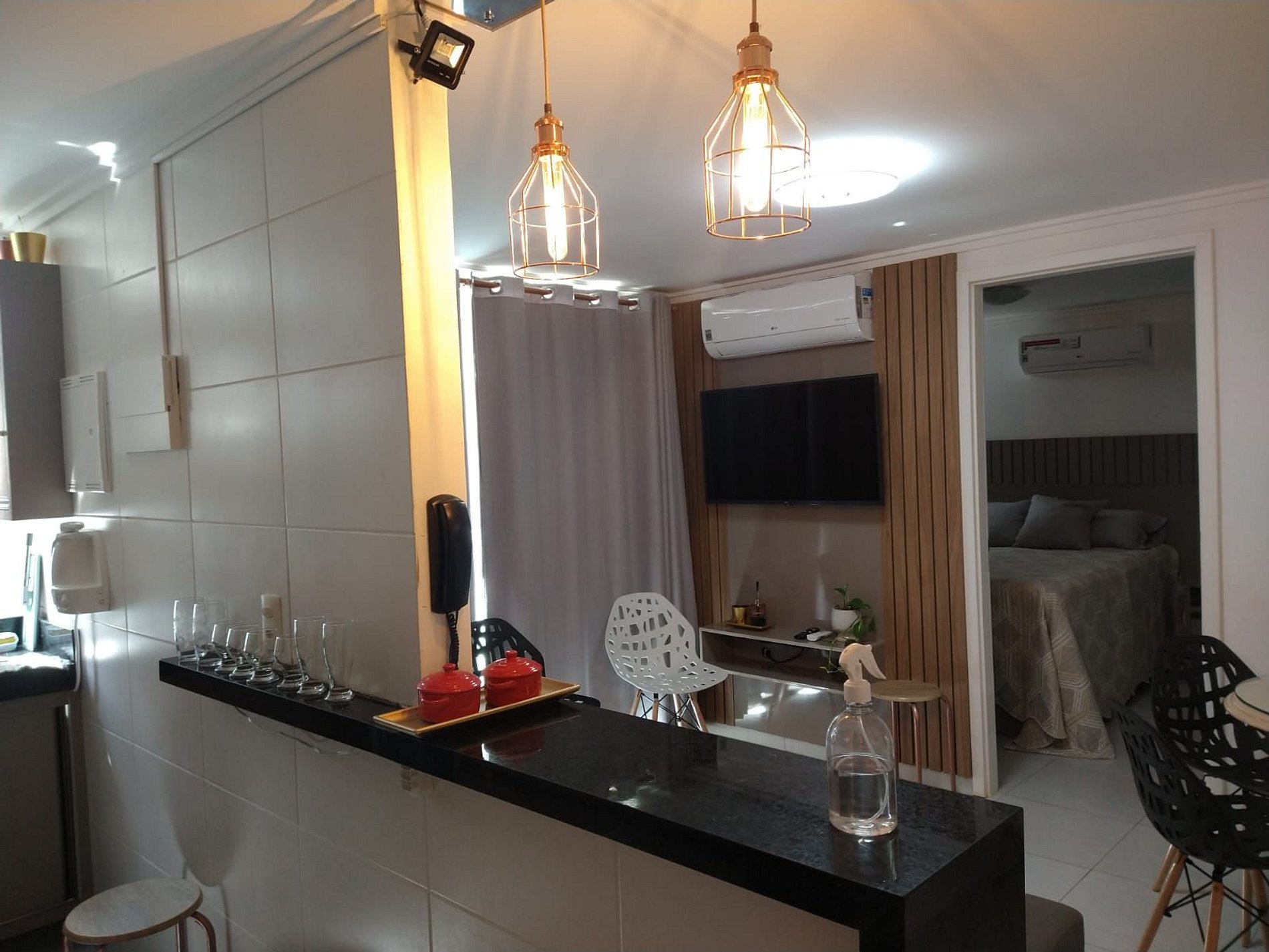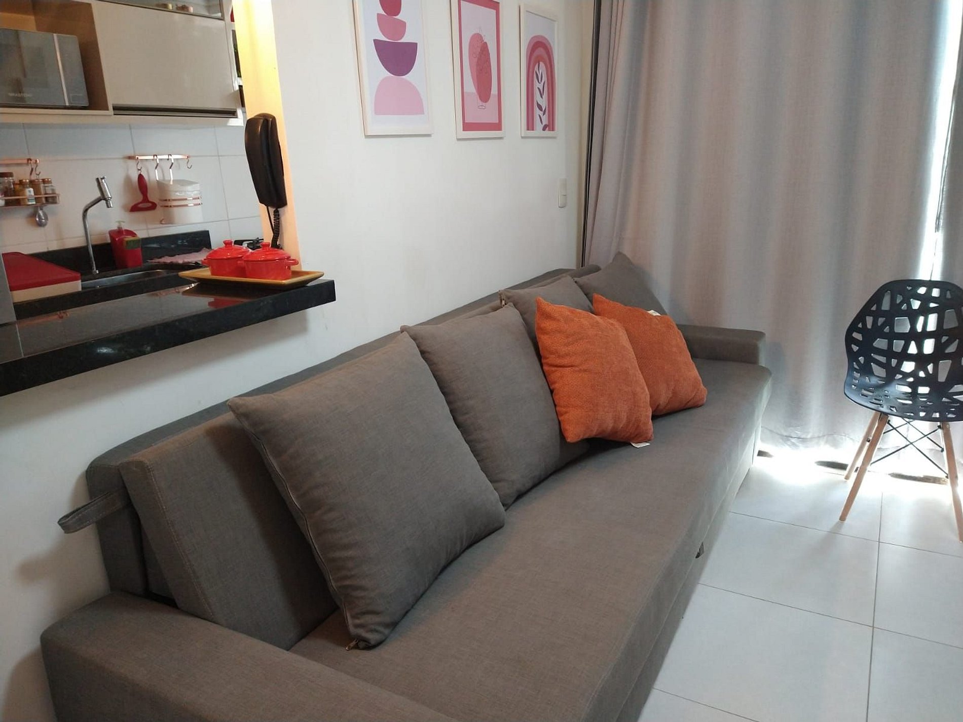 Apartamento muito bonito com 1 quarto com cama de casal, sala com sofá-cama para até três pessoas, cozinha totalmente equipada.
