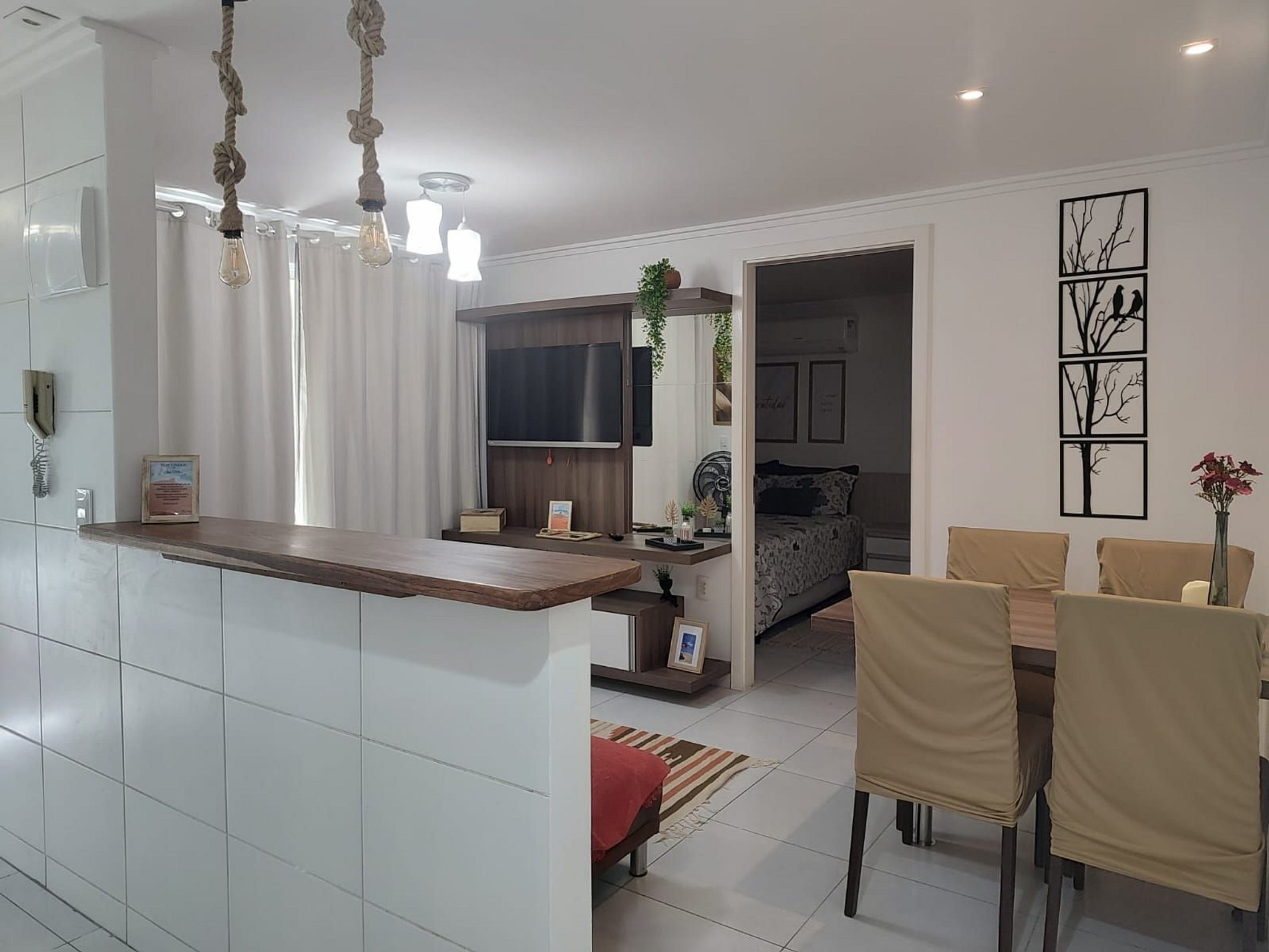O apartamento pode acomodaar até 5 pessoas. Cama de casal, sofá-cama de casal e mais um colchão de apoio. Sala com mesa e cadeiras para as refeições e varanda. Tv na sala e TV no quarto. Cozinha completa!