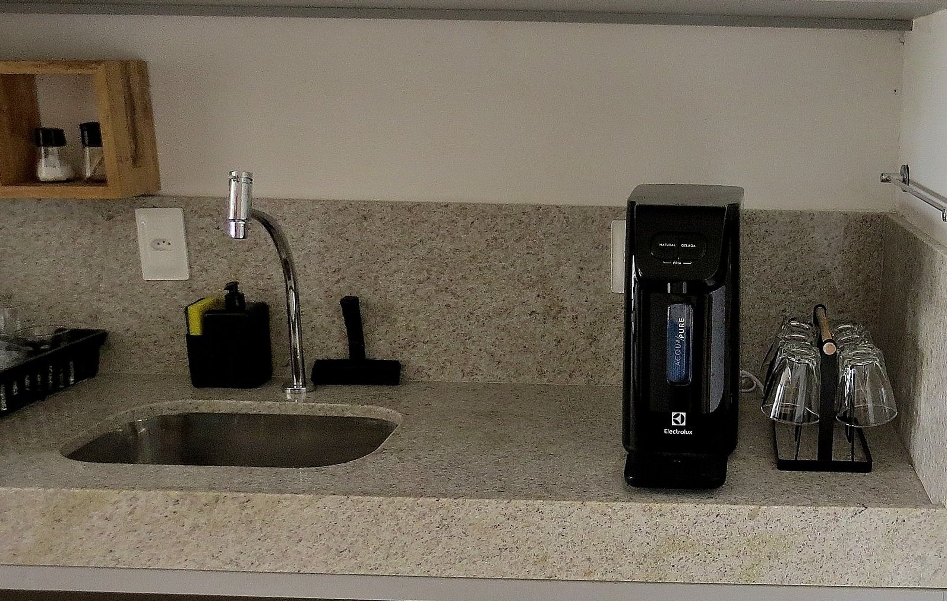 Temos cozinha totalmente equipada e completa. Pode preparar qualquer refeição nela. Na sala tem mesas e cadeiras para as refeições, Smart TV e varanda com uma rede. Tudo olhando para o nascente! Há além do da suíte, um banheiro social completo. Os banhairos contam com água fria e quente.