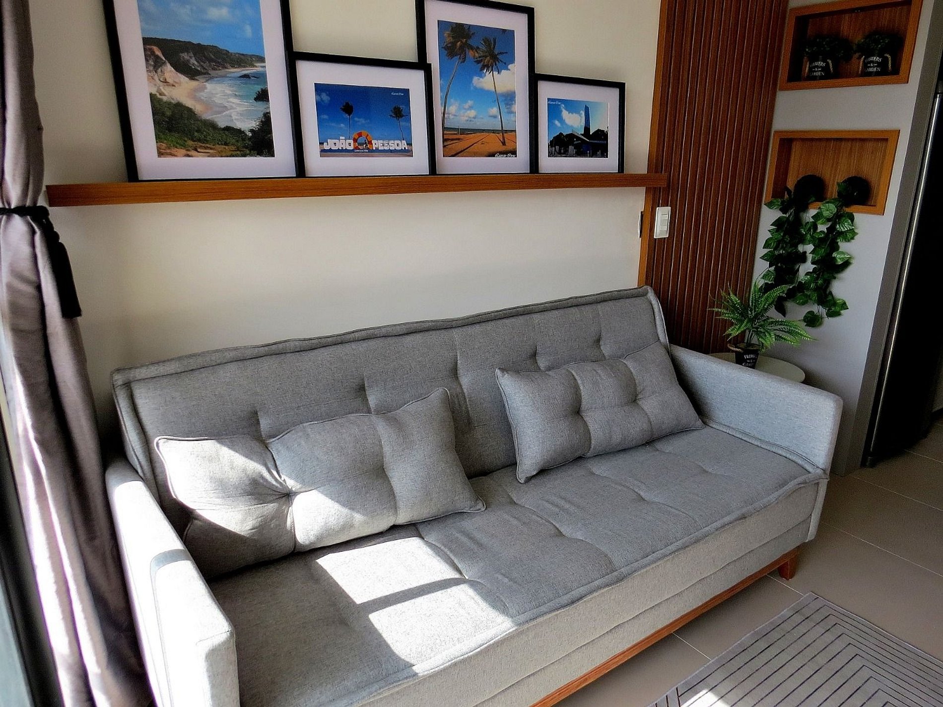 O apartamento, que tem 47 m², foi tudo preparado pensando em vocês, os hóspedes, para que se sintam bem e felizes. O apartamento tem dois quartos sendo um deles suíte. Na suíte tem cama de casal. No outro quarto tem um beliche (2 pessoas). Ambos quartos tem ar condicionado. Na sala tem ainda um sofá-cama que acomoda duas pessoas.