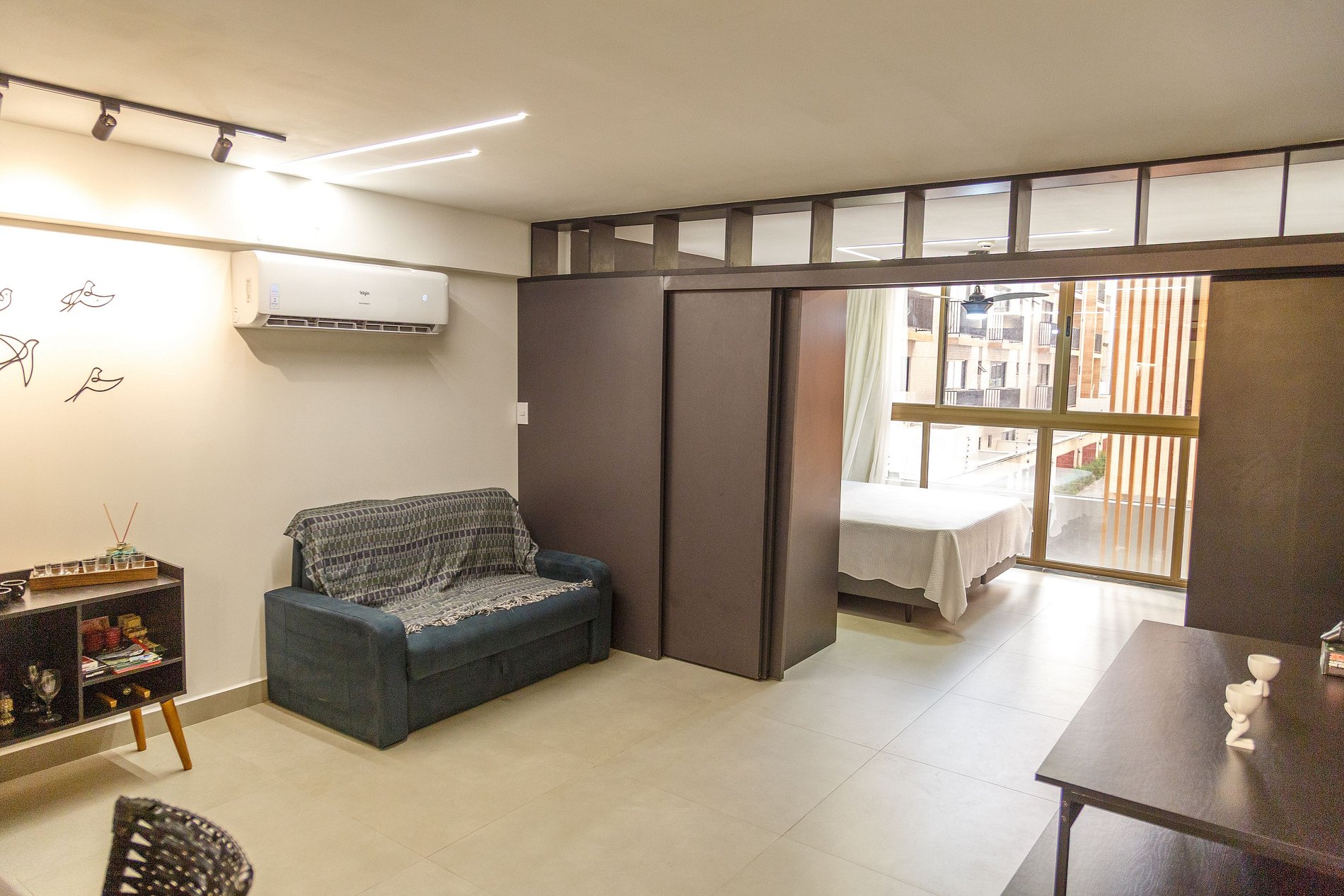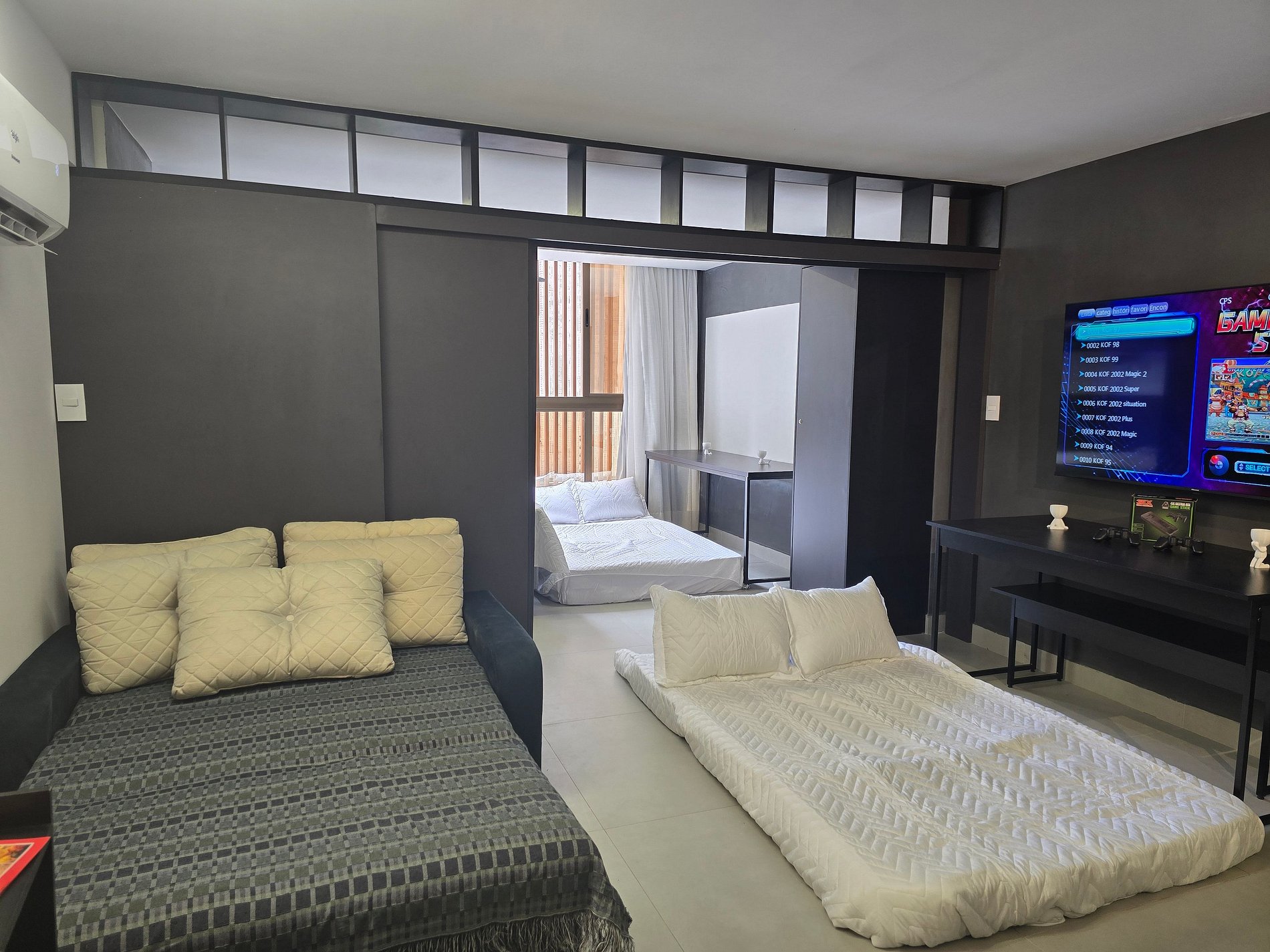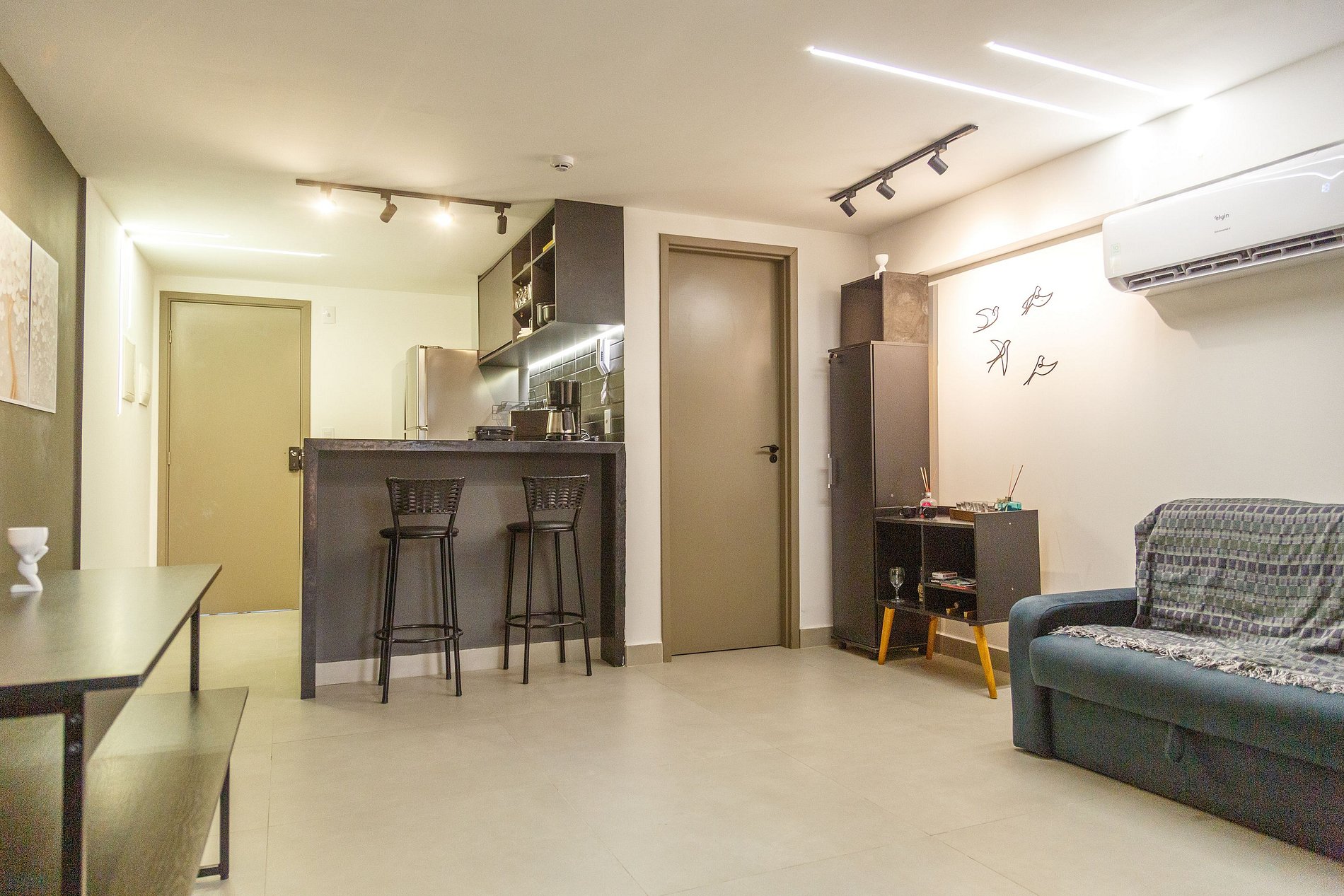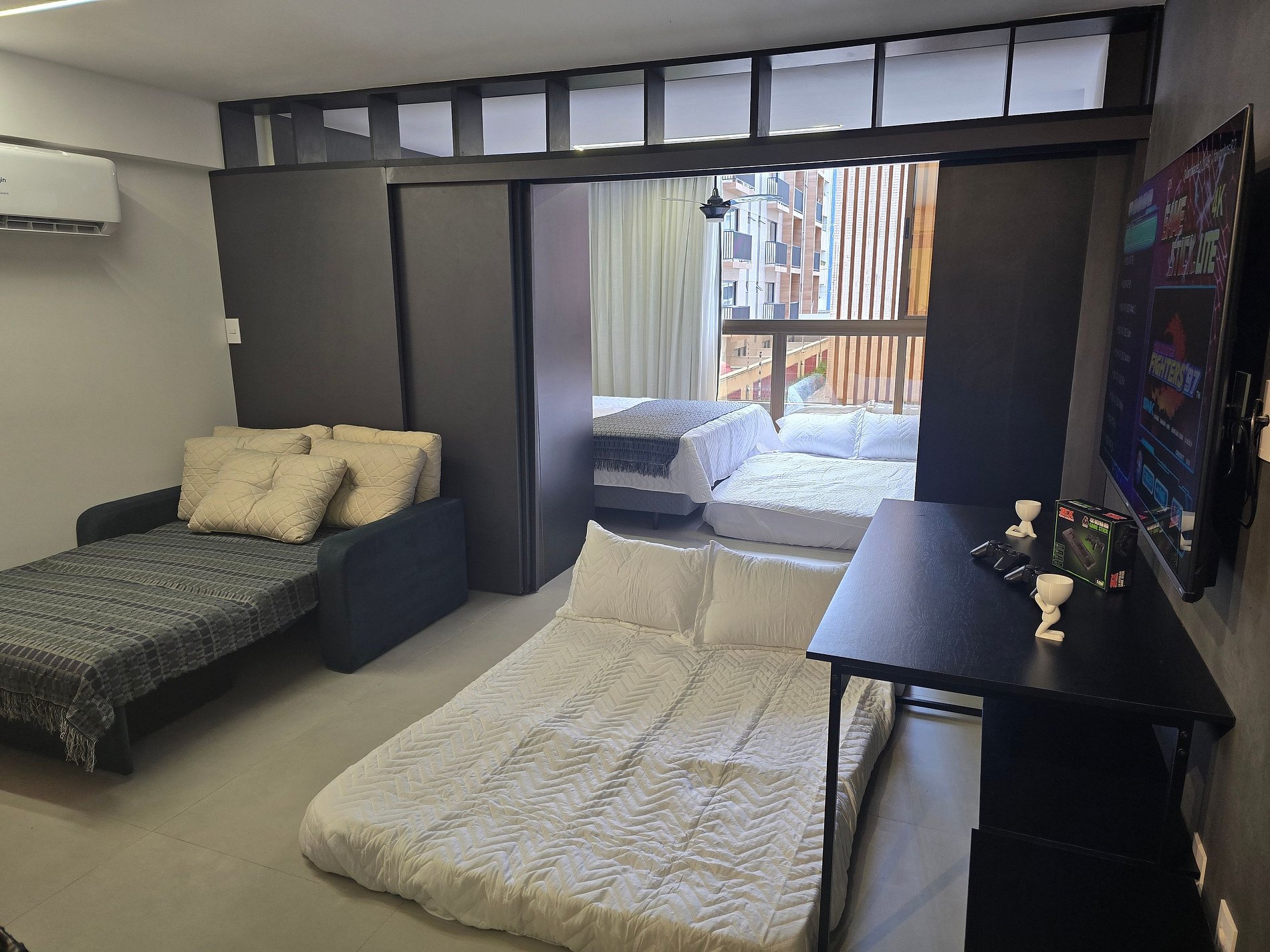 Fantástico apartamento flat, a 50m da praia, com 1 quarto e banheiro. Ar-condicionado e Smart TV, além de videogame e projetor estilo cinema. O apartamento conta com divisória projetada garantindo privacidade ao espaçoso quarto de casal, que possui cama queen e acomoda até 4 pessoas, utilizando um colchonete no chão. Na sala, há um sofá-cama casal e um colchonete, também com capacidade para 4 pessoas, além de uma mesa de jantar para 6 pessoas e uma bancada com cadeiras altas para duas pessoas.