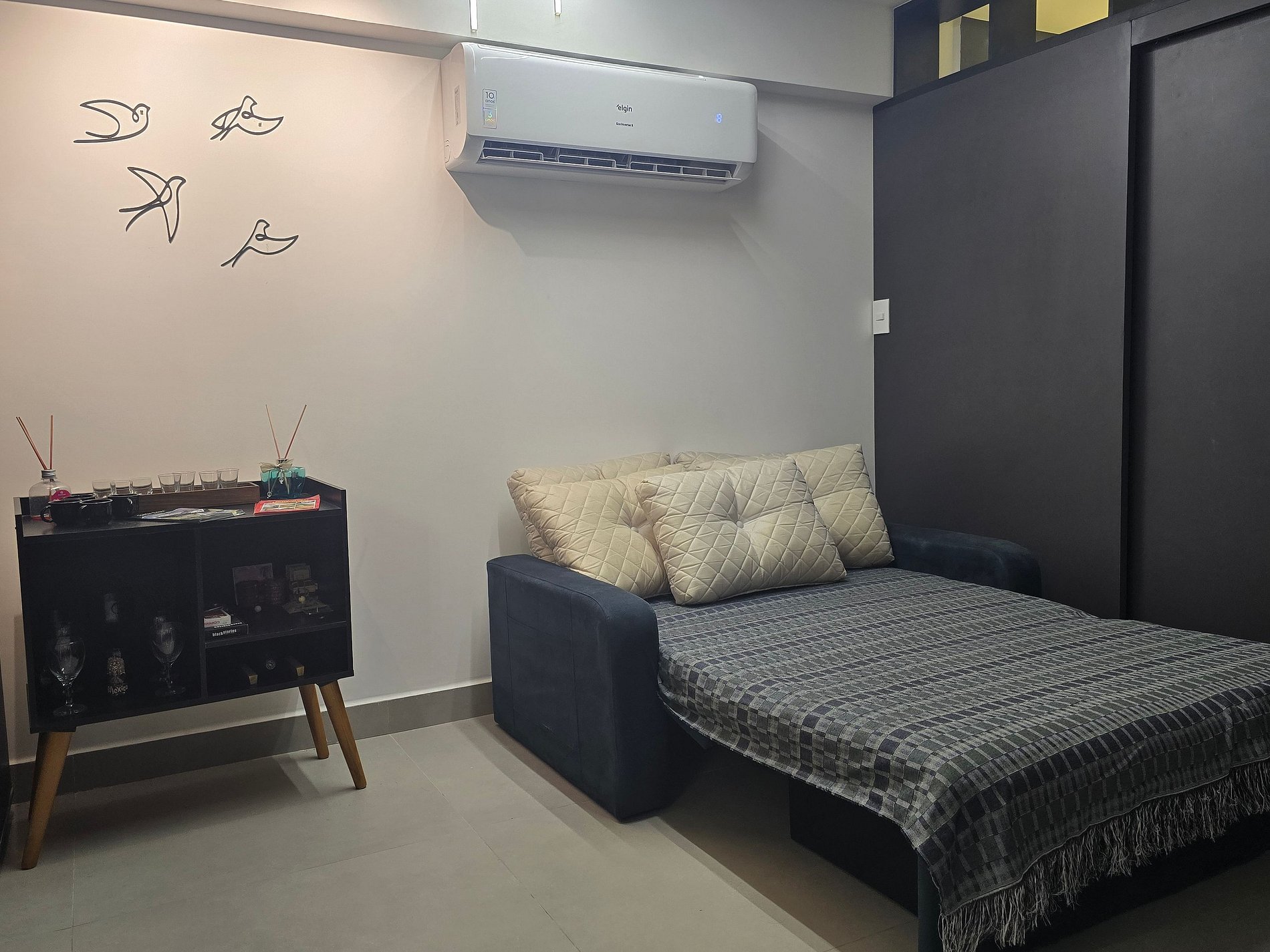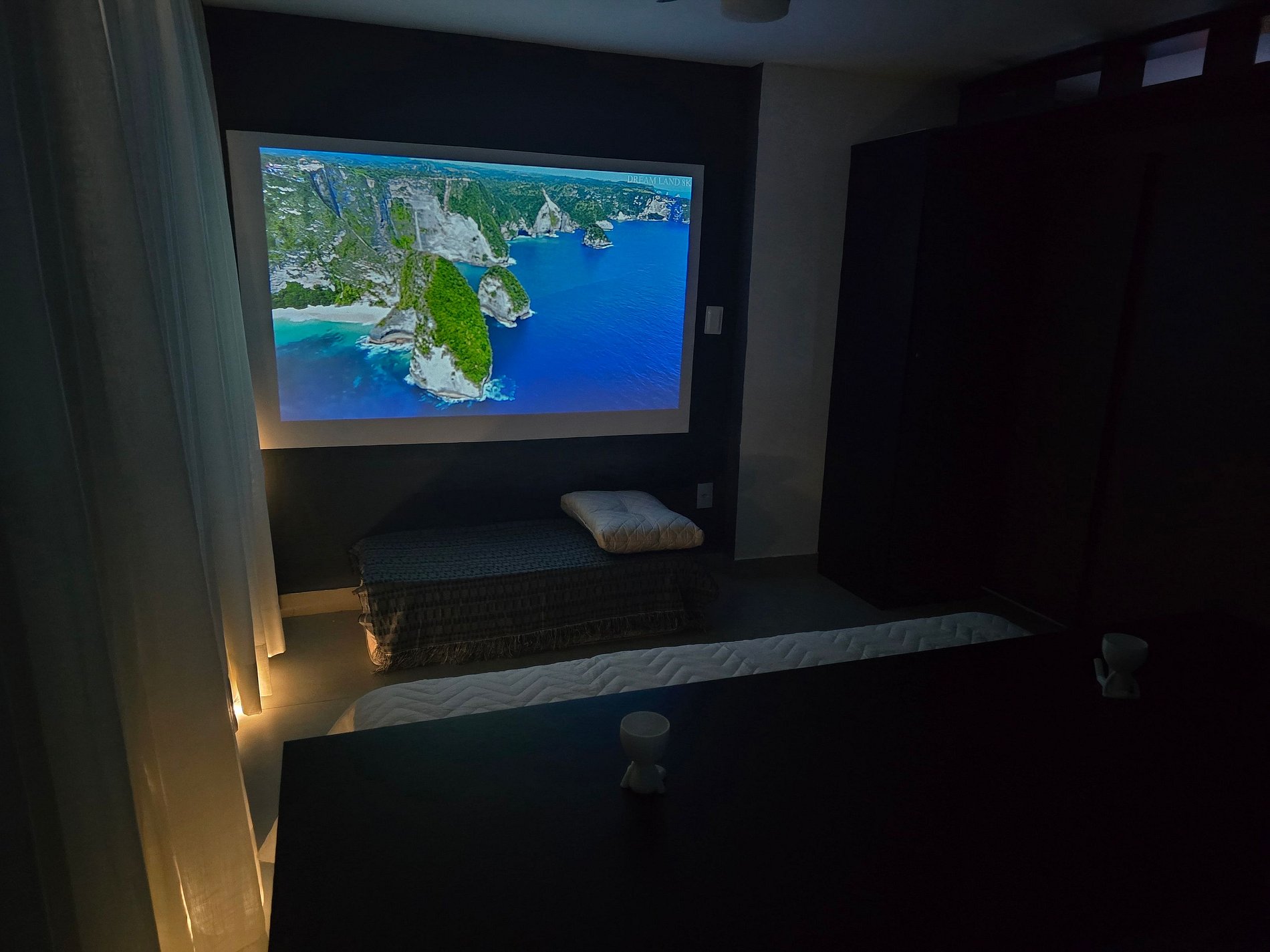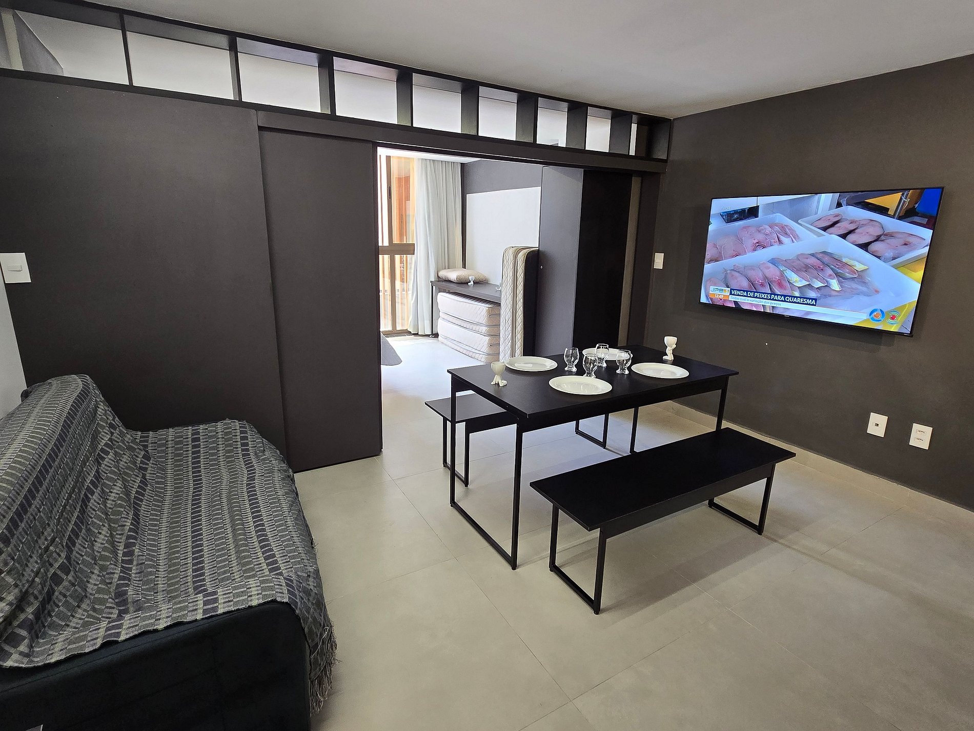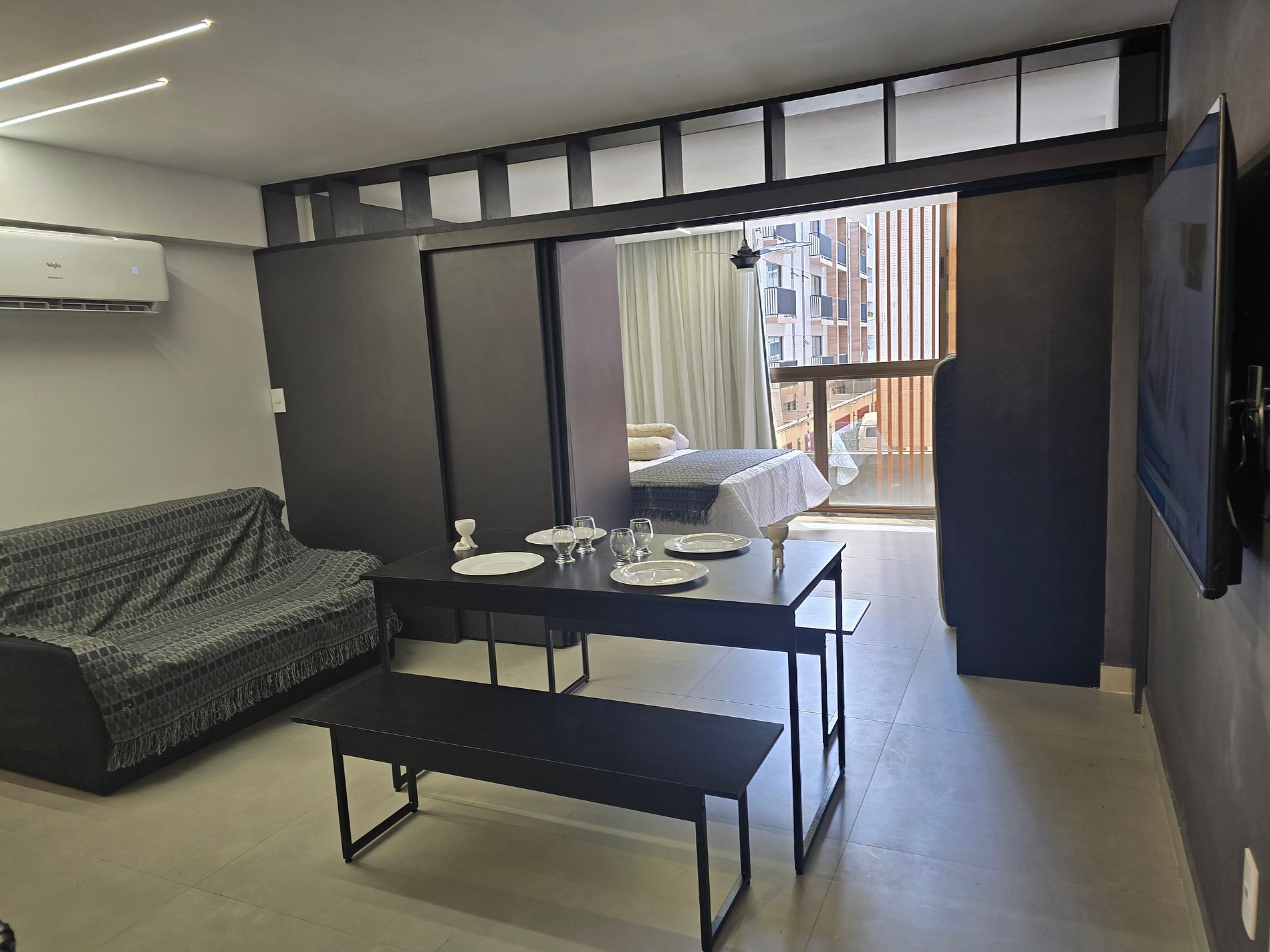 Fantástico apartamento flat, a 50m da praia, com 1 quarto e banheiro. Ar-condicionado e Smart TV, além de videogame e projetor estilo cinema. O apartamento conta com divisória projetada garantindo privacidade ao espaçoso quarto de casal, que possui cama queen e acomoda até 4 pessoas, utilizando um colchonete no chão. Na sala, há um sofá-cama casal e um colchonete, também com capacidade para 4 pessoas, além de uma mesa de jantar para 6 pessoas e uma bancada com cadeiras altas para duas pessoas.