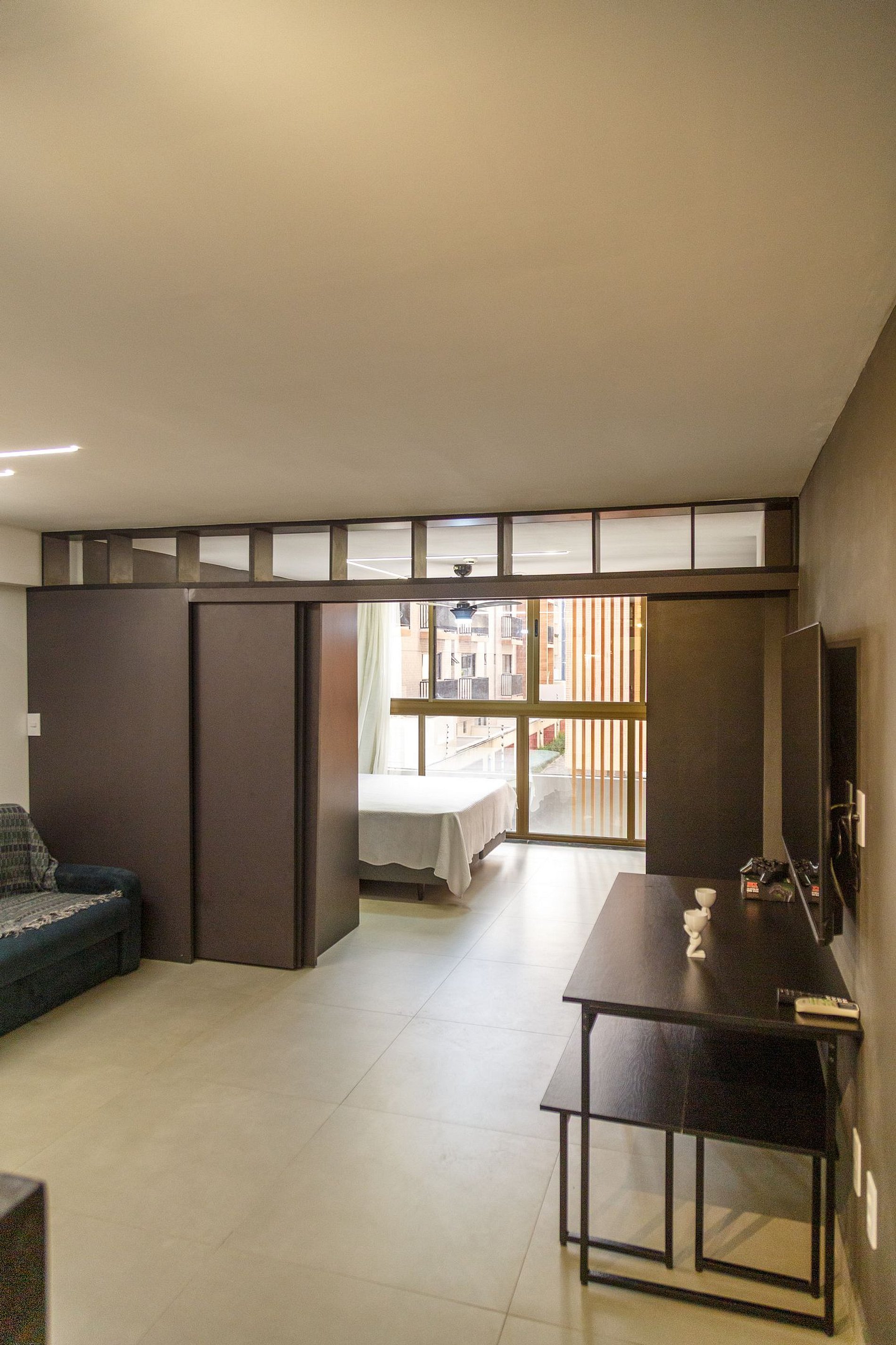 Fantástico apartamento flat, a 50m da praia, com 1 quarto e banheiro. Ar-condicionado e Smart TV, além de videogame e projetor estilo cinema. O apartamento conta com divisória projetada garantindo privacidade ao espaçoso quarto de casal, que possui cama queen e acomoda até 4 pessoas, utilizando um colchonete no chão. Na sala, há um sofá-cama casal e um colchonete, também com capacidade para 4 pessoas, além de uma mesa de jantar para 6 pessoas e uma bancada com cadeiras altas para duas pessoas.